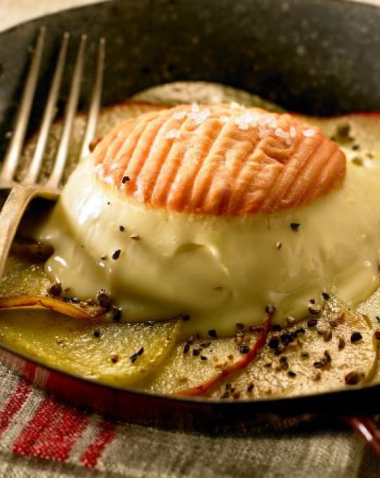 Ingrédients : 4 pommes de terre à chair ferme, 1 époisses Berthaut, 20g de beurre doux, 2 petites pommes, 1 œuf, poivre et sel, ½ cuillère à café de baies roses.