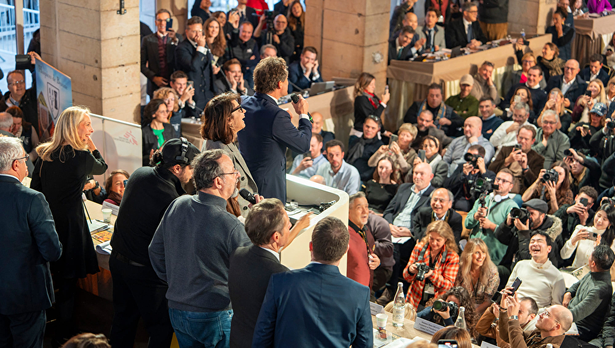 Le point d’orgue du week-end, est la vente aux enchères, organisée par une prestigieuse maison (Christies de 2005 à 2020, Sotheby's à partir de 2021), et présidée par une star, le dimanche après-midi sous les Halles de Beaune.