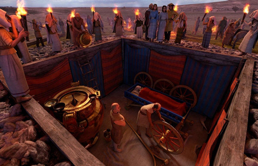 À ses côtés, ne se trouvaient pas uniquement de somptueux bijoux mais bien toute une infrastructure des plus remarquables. Au coeur de son tombeau, qui mesurait trois mètres de côté tout de même, ont été découverts de nombreux autres trésors. Un grand char d'apparat, des vases grecs en terre cuite, des coupes en bronze...