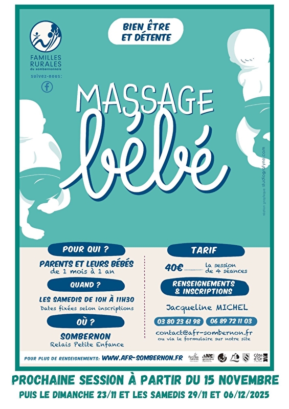 Pour plus d’informations et pour vous inscrire, rendez-vous ici : https://www.afr-sombernon.fr/massage-bb ou appelez Jacqueline au 06 89 21 11 03.