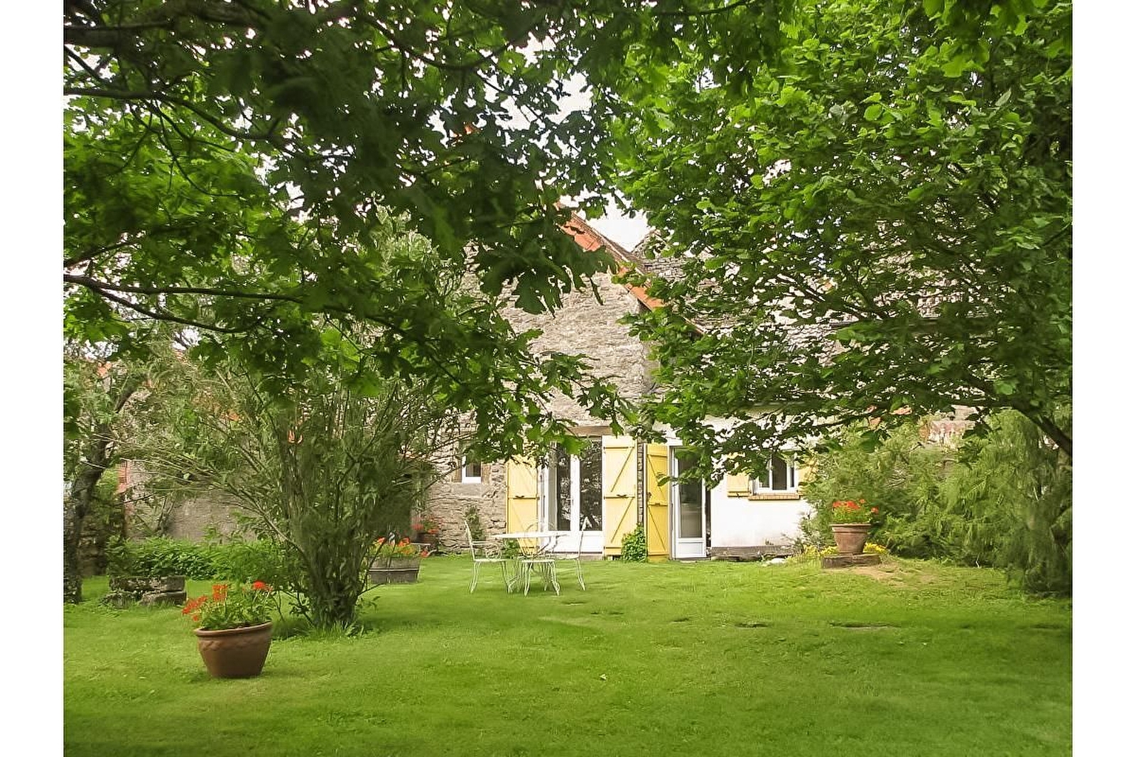 chambre-mezzanine (1 lit 140. 1 lit bébé). Salle d'eau, wc. Grand jardin commun de 1700 m² clos, fleuri et