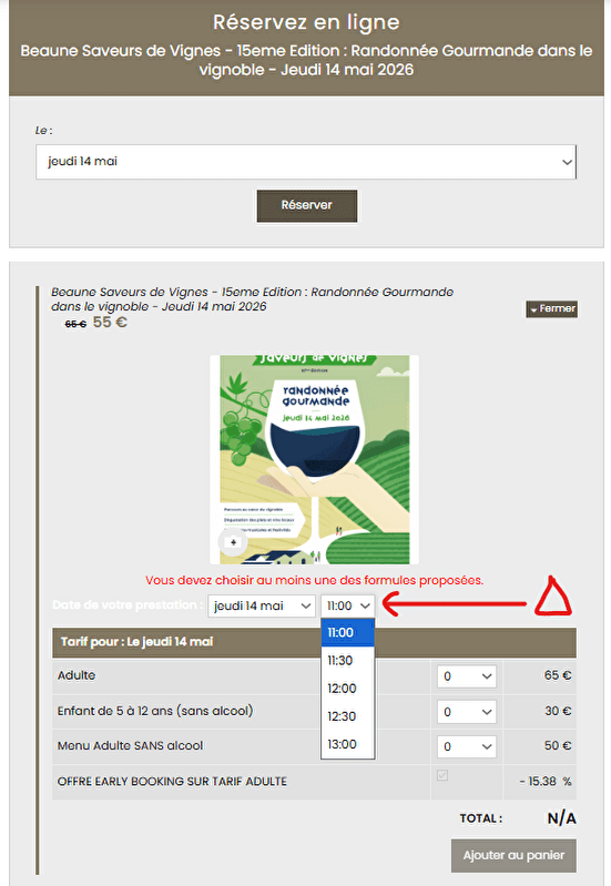 N’oubliez pas de sélectionner, sur la billetterie de l’office de tourisme de Beaune, à côté de la mention de la date de la balade, l’un des 5 départs proposés : 11h, 11h30, 12h, 12h30 et 13h. merci :-)