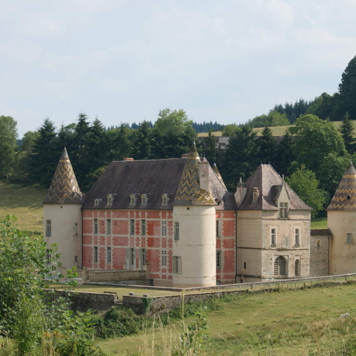 Installé au pied de la colline du Gros Moux dans une zone de sources qui jadis alimentaient les douves, il se présente comme un quadrilatère cantonné de grosses tours rondes percées de meurtrières et couvertes de toits en poivrière colorés. Fondé au XIIe s. et reconstruit en grande partie au XVIIe s., il possède un corps de logis à façade polychrome de type Renaissance italienne. La salle à manger Louis XIV pavée de céramique et meublée en style Henri II possède un extraordinaire plafond à la française rehaussé de guirlandes de fleurs et de portraits des différents propriétaires du château. Dans le salon Louis XV, les lambris sont d'époque et le plafond décoré de stucs colorés.