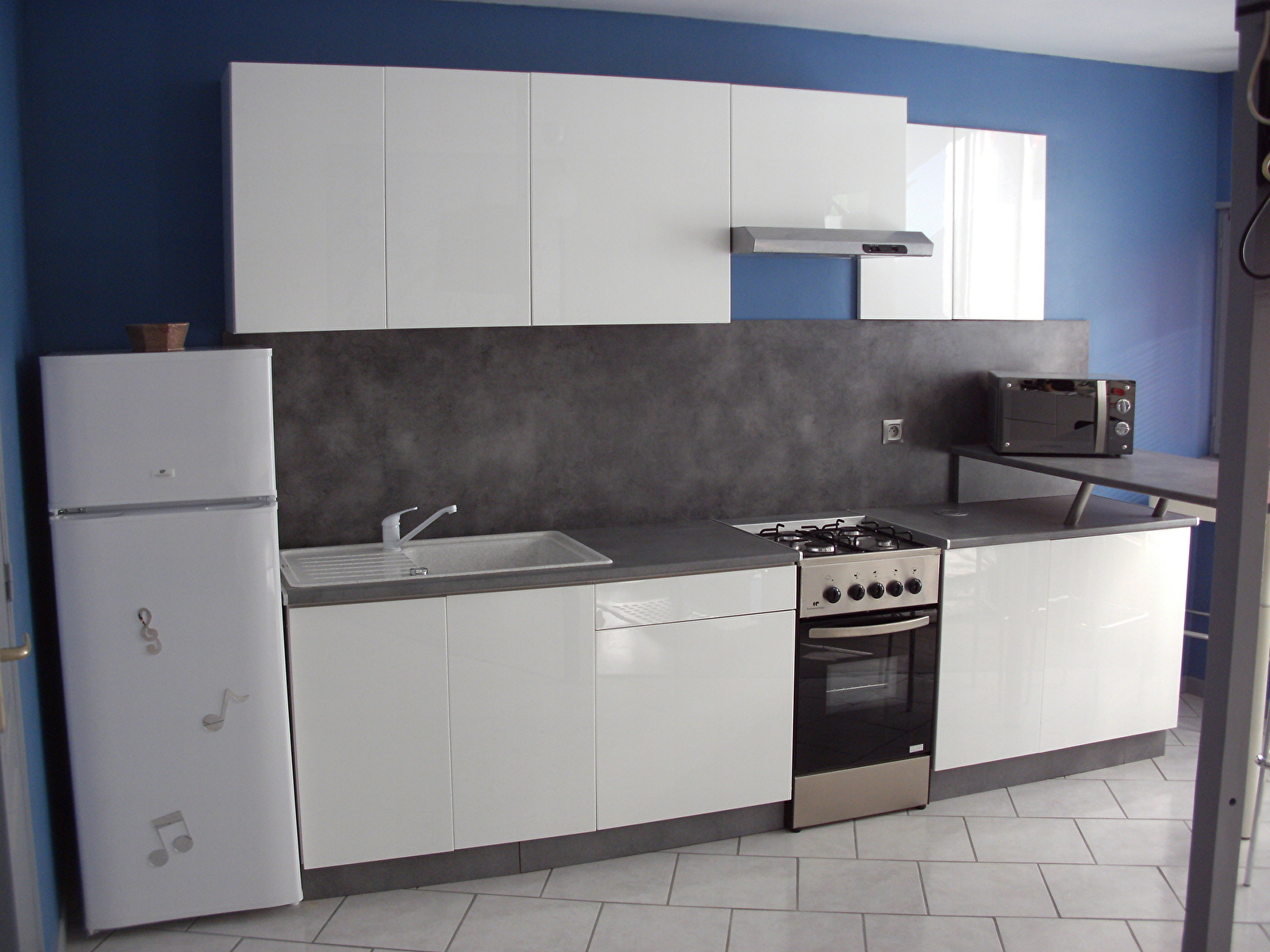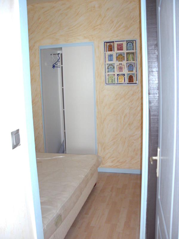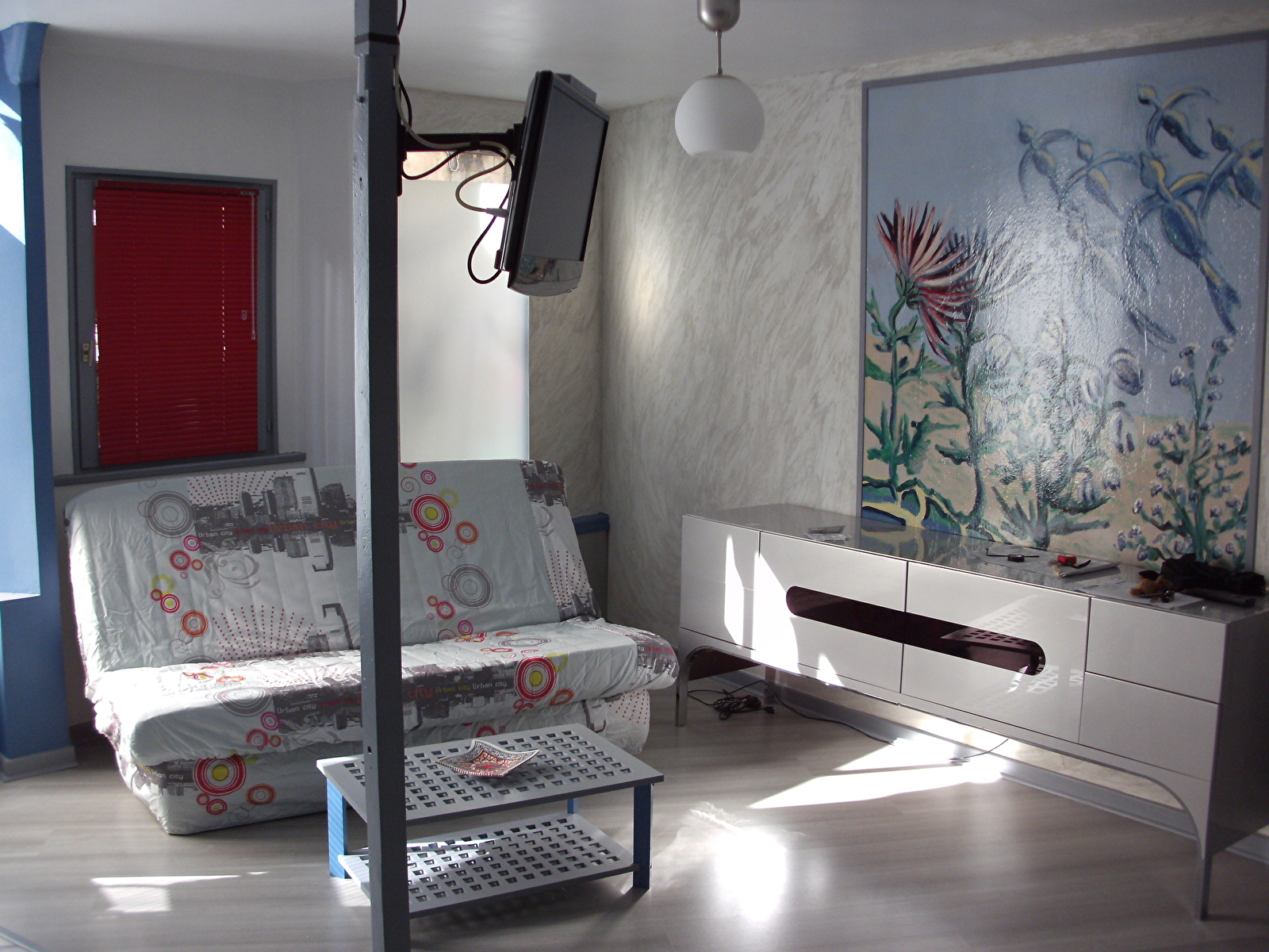 Pièce de vie à la décoration contemporaine avec clic clac, télévision, internet, cuisine équipée (gazinière, micro-ondes, réfrigérateur, cafetière Senséo, bouilloire, grille-pain), espace chambre indépendant avec lit 140, salle de bain douche, wc séparé.