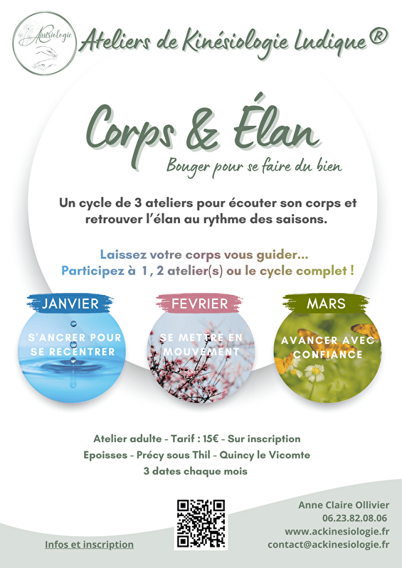 Corps & Elan est un programme de 3 ateliers de kinésiologie ludique®, conçus pour vous accompagner par un travail par le corps, en douceur, dans le mouvement et l’écoute de soi sur le 1er trimestre.