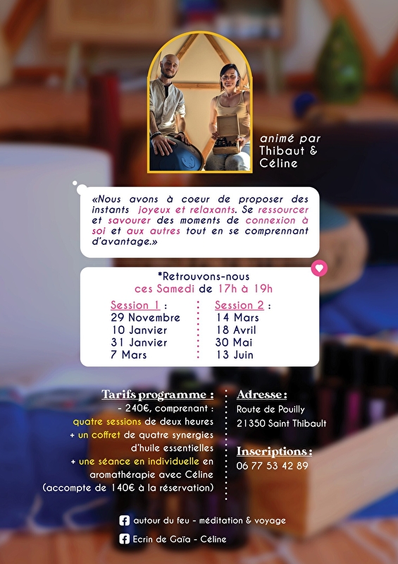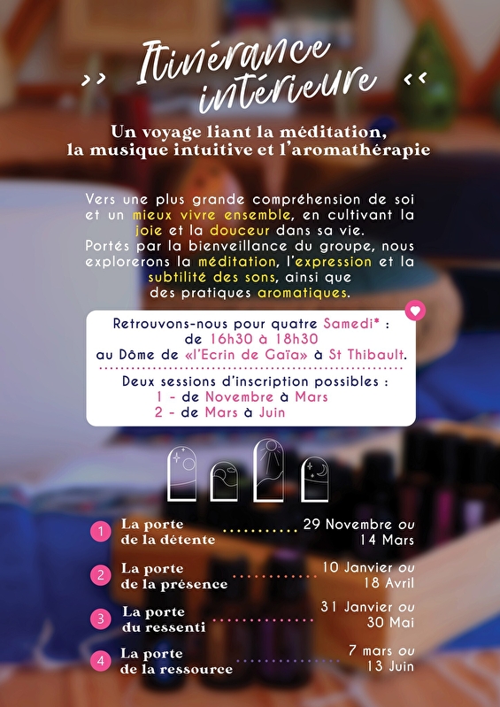 Itinérance intérieure : atelier de méditation, musique intuitive et aromathérapie.