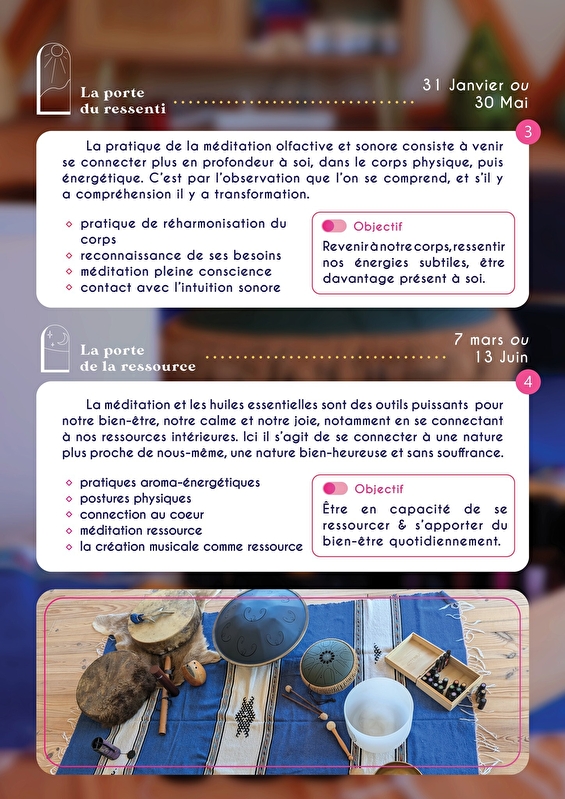 Porté·e par l’énergie du groupe, tu chemineras entre méditations guidées, voyages sonores, pratiques olfactives et moments de partage sincère.