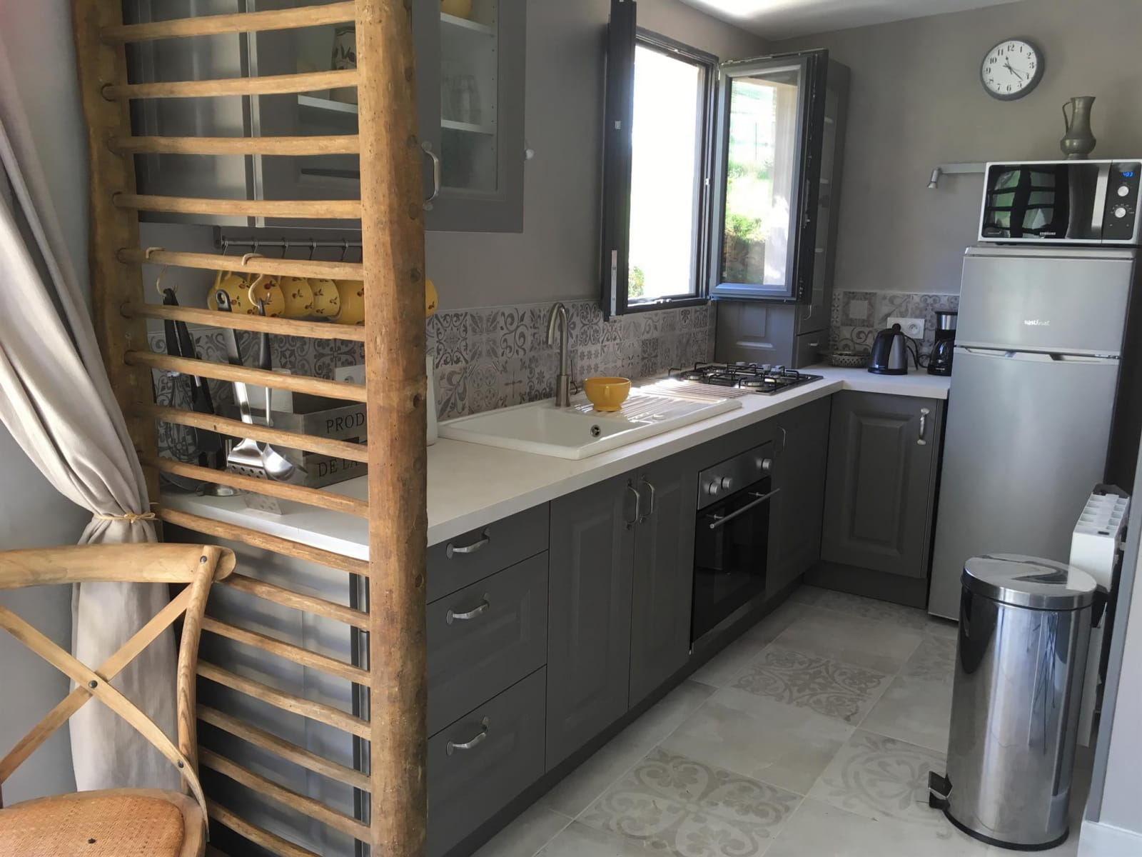 Salle de séjour avec salon, poêle à bois. Cuisine ouverte équipée. Une chambre avec un lit 160. Salle d'eau avec douche à l'italienne et WC séparé. Buanderie et abri vélos.
