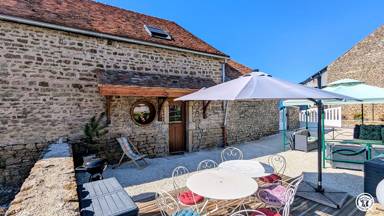 Dans un petit village au coeur de l'Auxois, le gîte "La Longère des oies", jolie maison en pierres entièrement rénovée avec de beaux matériaux, vous offre : au rez-de-chaussée : cuisine équipée ouverte sur salle à manger/salon, avec TV, Wifi, poêle à bois (bois fourni) , 1 WC indépendant avec table à langer, 1 salle d'eau avec douche italienne, 1 buanderie (avec lave-linge, sèche-linge et grand frigo avec congélateur). Climatisation réversible. A l'étage : 1 chambre avec 1 lit de 140 cm avec TV, 1 WC indépendant, 1 chambre avec 1 lit de 140 cm avec TV et 1 mezzanine proposant 1 chambre "enfant", avec 2 lits de 90 cm (non adaptée à des adultes car très mansardée). Supplément par enfant : 10€/nuit/enfant (à réserver et régler auprès du service réservation). Matériel pour bébé à disposition : lit parapluie, chaise haute, table à langer, baignoire, pot et réducteur de WC.
