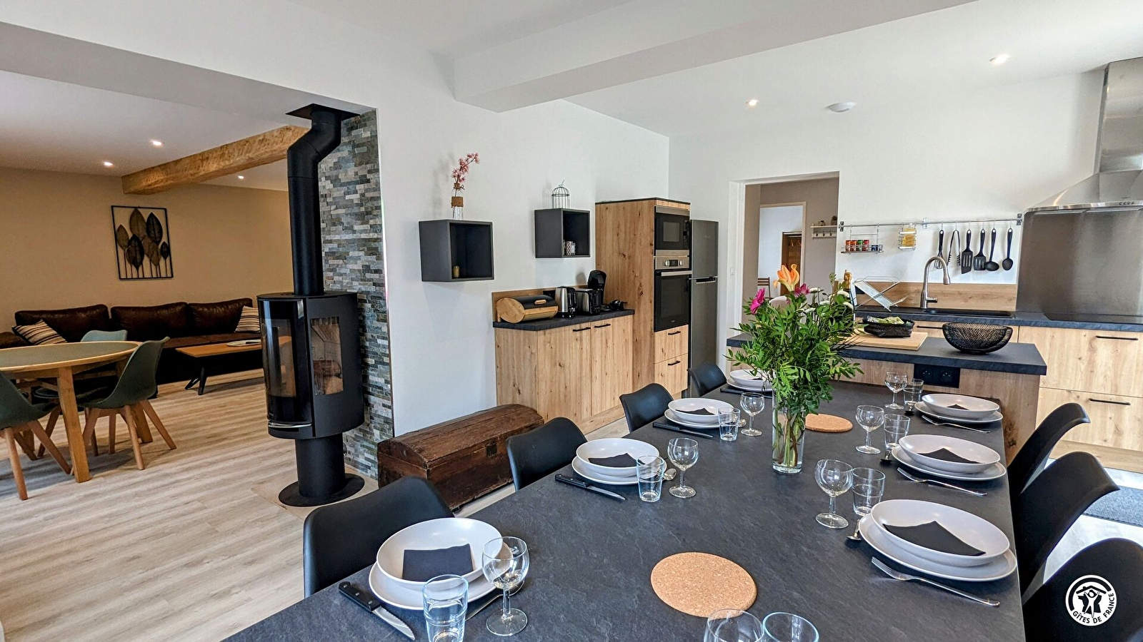 A l'extérieur : Terrasse couverte par voile d'ombrage, salon de jardin, barbecue, brasero, 1 salon de détente, 1 terrain de pétanque, 1 local pour les vélos - Gîte situé à proximité d'une route passante (pas de nuisance à l'intérieur). Animaux acceptés sur demande. Parking privatif, prise renforcée pour la recharge des véhicules électriques (recharge lente). Possibilité de disposer d'un local pour mettre les motos à l'abri (gîte "Accueil motard"). Possibilité de garer 4 voitures dans la cour.