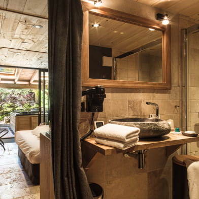 Chambre avec 2 terrasses discrètes et spa privatif.