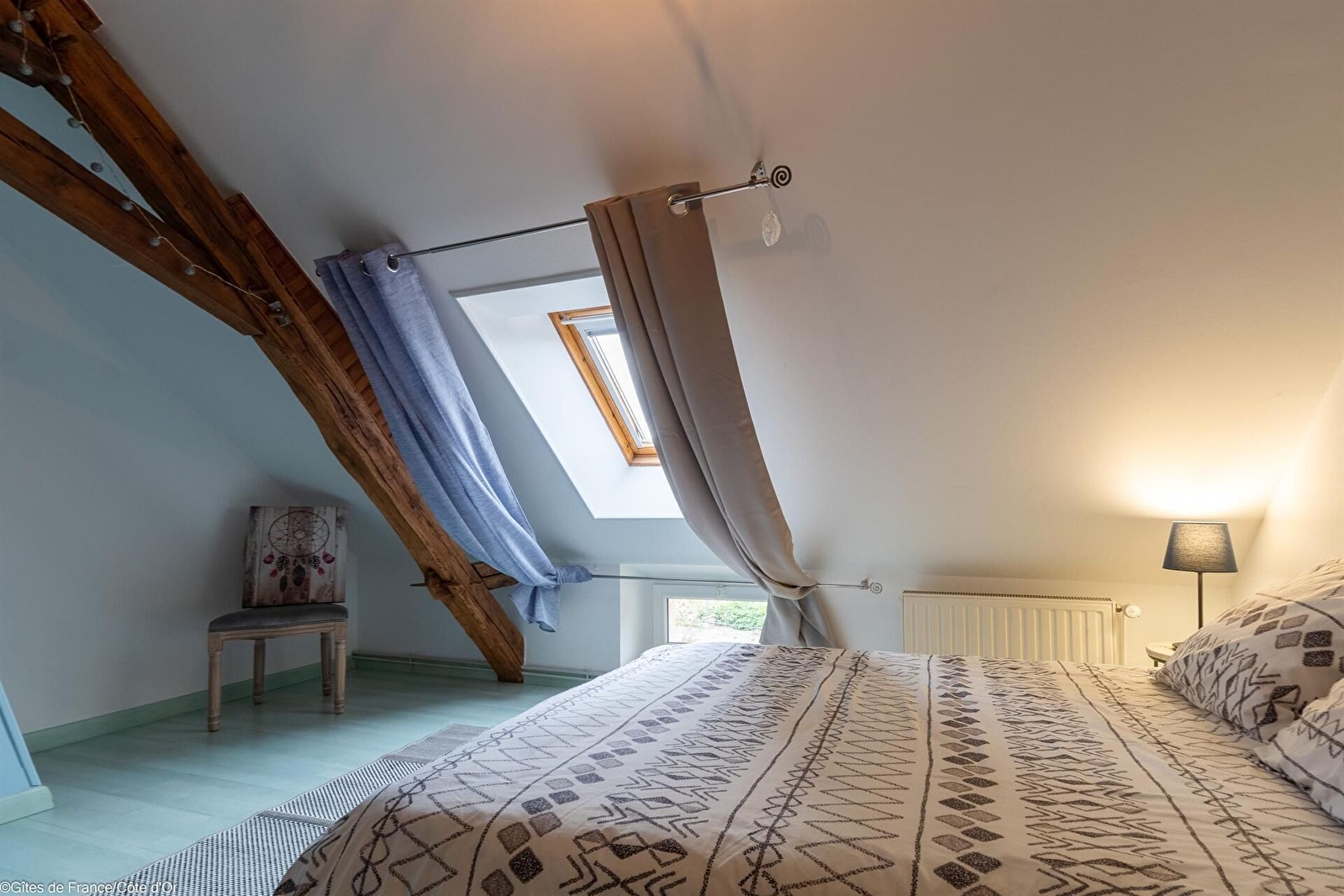 Etage : une chambre avec un lit 140 et une chambre avec un lit 160. Salle de bains avec WC. Grand pallier avec 2ème salon permettant 2 couchages supplémentaires en canapé convertible.