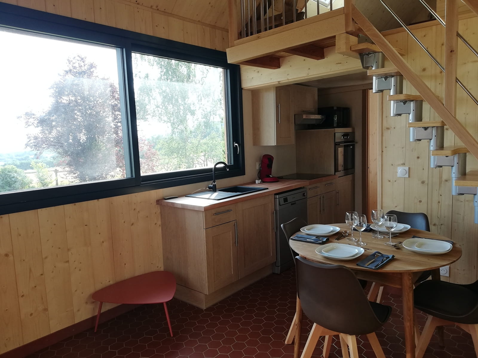 Lodge entièrement rénové par un artisan spécialisé dans la maison en ossature bois, avec grandes fenêtres et velux panoramiques, tout en bois local. Ce superbe Lodge offre une prestation intérieur tout confort : 1 grande chambre avec dressing avec lit de 160*200, 1 mezzanine, équipée de 2 petits lits 90*200, spacieuse vous fait profiter de tout le paysage, une salle d’eau avec douche, pièce de vie et sa cuisine toute équipée ouverte : Four, micro-onde, robot de cuisine, réfrigérateur congélateur, lave-vaisselle. La pièce de vie est dotée d’une télévision à écran plat avec Amazon prime vidéo. La maison a la WIFI. Le mobilier est neuf et sa literie de qualité.