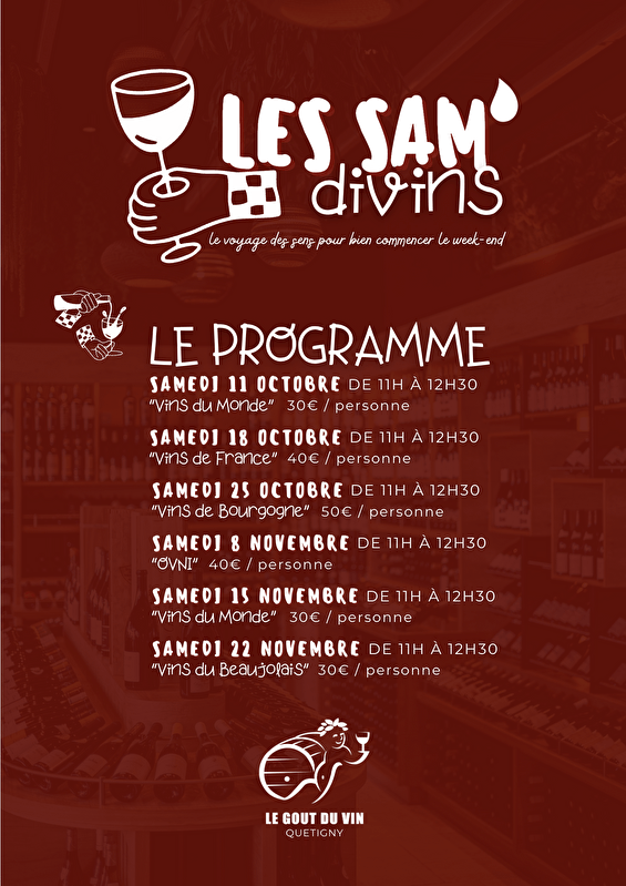 Notre cave à Quétigny se transforme en lieu de découvertes œnologiques avec Les Sam’Divins : une dégustation thématique autour de 6 vins soigneusement sélectionnés.