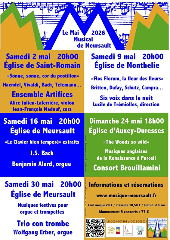 Avec la troisième édition du Mai Musical de Meursault, nous sommes heureux de vous donner rendez-vous pour un concert chaque week-end du joli mois de mai. Sortez de chez vous et profitez du printemps en musique dans notre beau village de Meursault et dans les villages environnants, cette année à Saint-Romain, Monthelie et Auxe-Duresses.