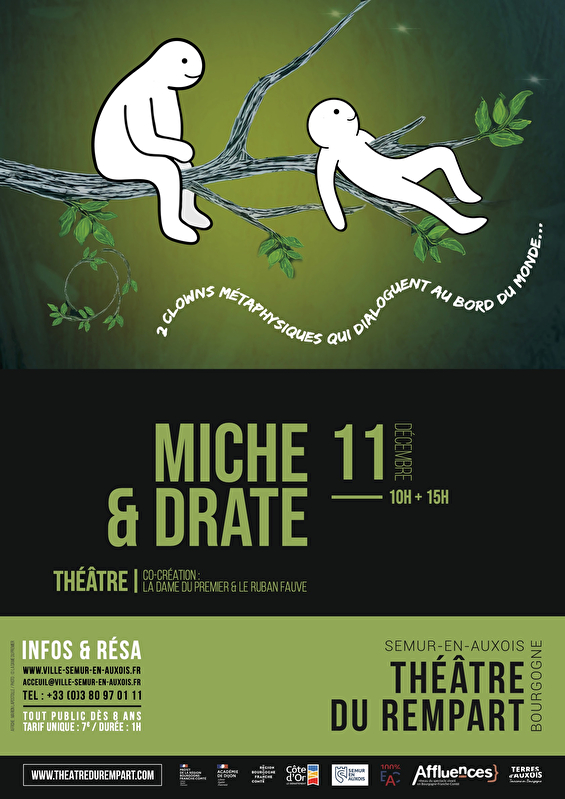 Miche et Drate sont 2 clowns métaphysiques, sans âge ni sexe ; qui s’essaient à être et se posent des questions philosophiques avec poésie.