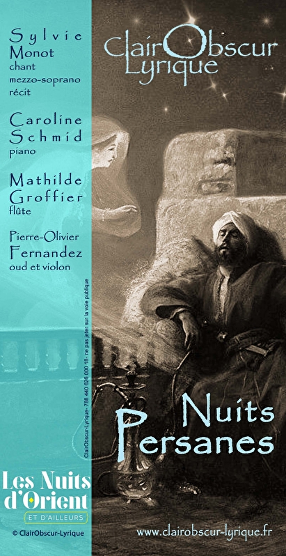 Dans le cadre du festival « Les nuits d’Orient et d’Ailleurs » 2024 à Dijon, ClairObscur-Lyrique présente « Nuits Persanes » concert flûte-chant-piano-oud-violon-récit.