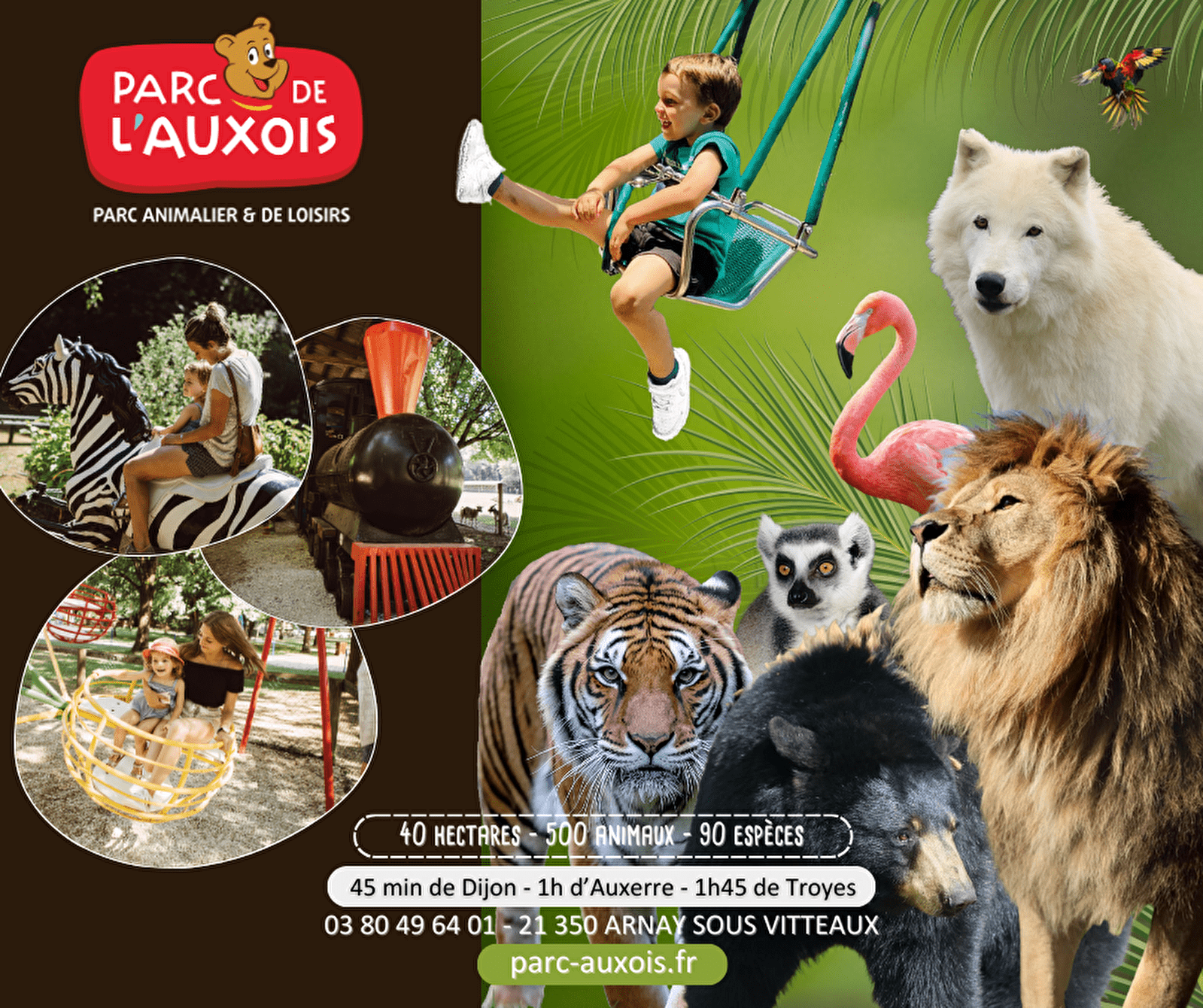 Au cœur de l'Auxois, découvrez un écrin de verdure de 40 hectares où s’ébattent plus de 500 animaux (représentant 90 espèces différentes). La rencontre avec les grands carnivores est l'un des temps forts de votre visite. Les "espaces d'immersion" vous mènent au plus proche des animaux : pénétrez dans les domaines des daims, alpagas, wallabies, maras et nandous ! Les chèvres naines vous accordent quelques caresses tandis que les loriquets, petits perroquets curieux et gourmands, viennent se délecter du nectar que vous leur proposez : vous serez au plus proche des animaux ! Soucieux de vous sensibiliser au monde animal, les soigneurs animaliers vous proposent tout au long de la journée des nourrissages et animations commentés dont l’inoubliable face à face avec les serpents. Le Parc de l’Auxois se veut également être un lieu de détente où les enfants profitent des manèges leur étant dédiés tandis que toute la famille apprécie les aires de jeux et le petit train. Atout supplémentaire, une piscine et ses toboggans aquatiques vous garantissent un rafraîchissement idéal sous la chaleur estivale de juillet et août.