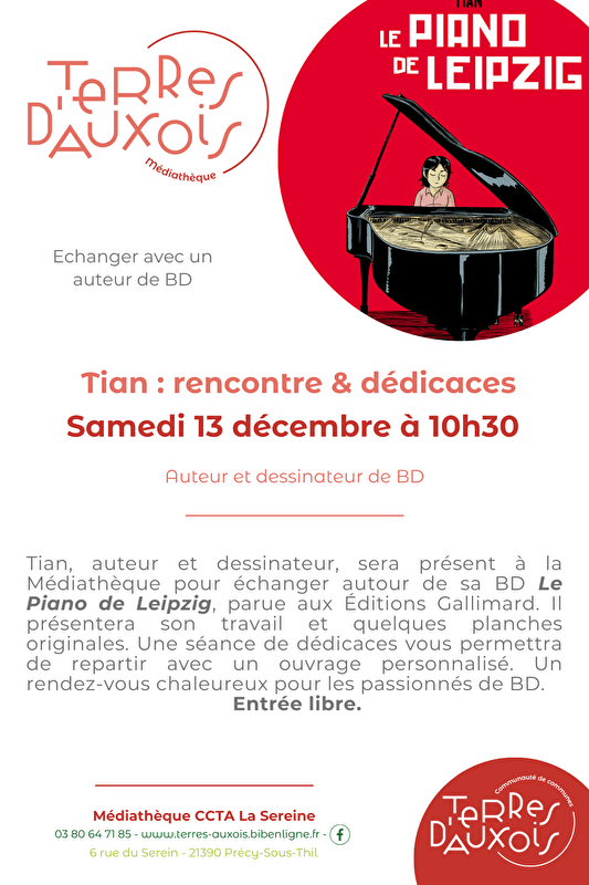 La médiathèque Le Sereine a le plaisir d’accueillir l’auteur de bande dessinée Tian pour une rencontre–dédicace autour de son nouvel ouvrage Le Piano de Leipzig.
