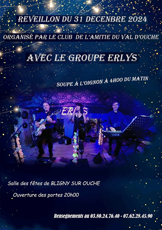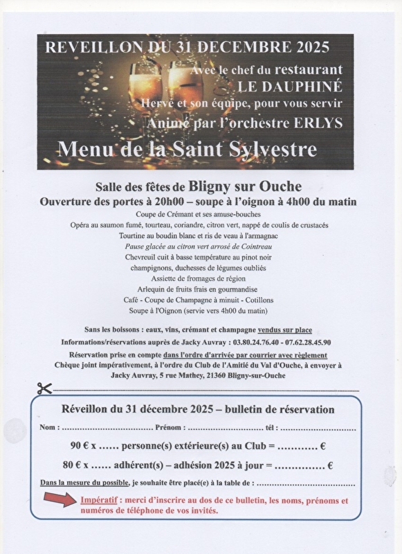 Venez faire la fête le 31 Décembre à Bligny sur Ouche pour terminer l'année en beauté dans la très belle salle des fêtes où vous pourrez danser jusqu'au bout de la nuit sur les musique du groupe Erlys et vous régaler avec le repas préparé par le chef du restaurant le Dauphiné. Coupe de champagne et cotillons offerts à minuit et soupe à l'oignon à 4h . Adhérents 80€, non adhérents 90€ .vins non compris. Boissons vendues sur place. Réservation avec bulletin ci joint . Renseignements au 0380247640 ou 0762284590