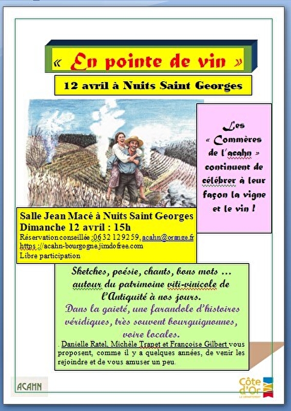 Les trois "Commères de l'Acahn", Danielle Ratel, Michèle Trapet et Françoise Gilbert proposent, comme il y a quelques années, de venir les rejoindre et de vous amuser un peu. Sketches, poésie, chants, bons mots … autour du patrimoine viti-vinicole, de l’Antiquité à nos jours. De la vigne au jardin d'Eden aux originalités d'une dégustation en passant par des histoires de moines, de fondues, de champagne, sans compter avec les aléas de la météorologie des vendanges en novembre ou fin juillet ! ...